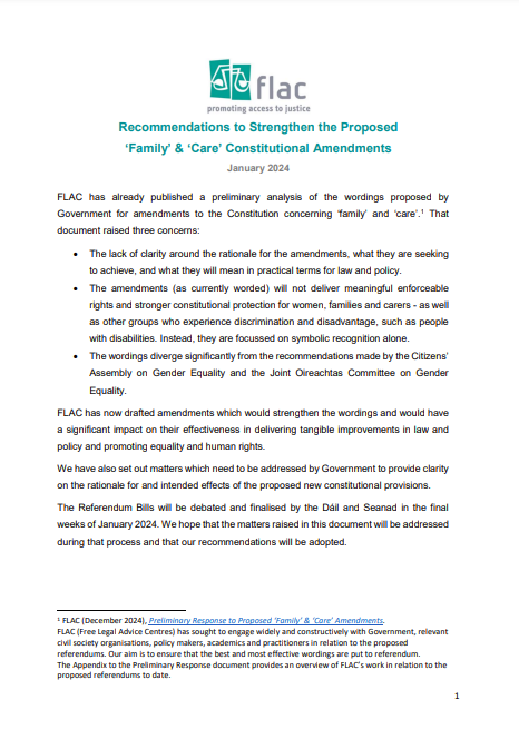 FLAC’s Recommendations to Strengthen the Proposed ‘Family’ & ‘Care’ Constitutional Amendments may be accessed here: https://www.flac.ie/assets/files/pdf/flac_recommendations_to_strengthen_the_proposed_family_and_care_amendments_0124.pdf