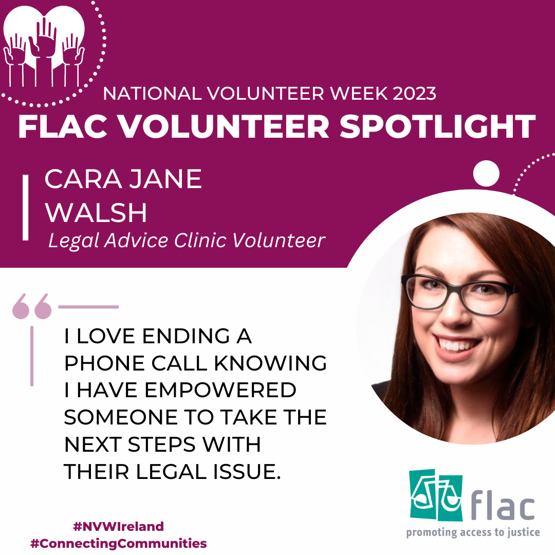 Our next #FLACVolunteer spotlight for #NVWIreland is Cara Jane Walsh. Cara has been volunteering in our Legal Advice Clinics since Feb 2020.