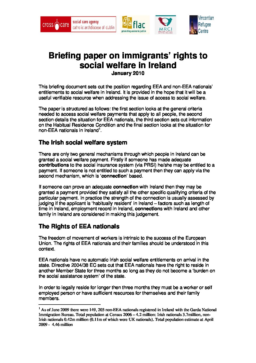 Briefing paper on Immigrants Rights to Social Welfare Jan 10