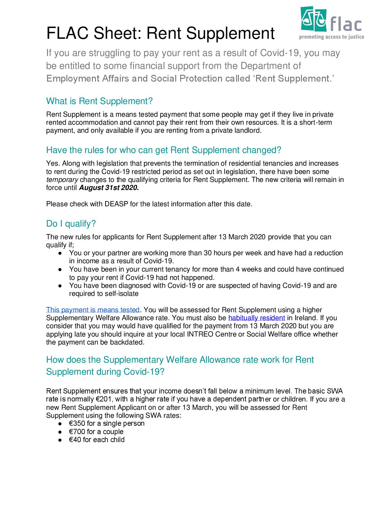 FLAC is producing a series of fact sheets on Covid19 related legal issues arising in family law, employment law, social welfare and debt. This sheet explains the extended rent supplement scheme during the current Covid19 outbreak.