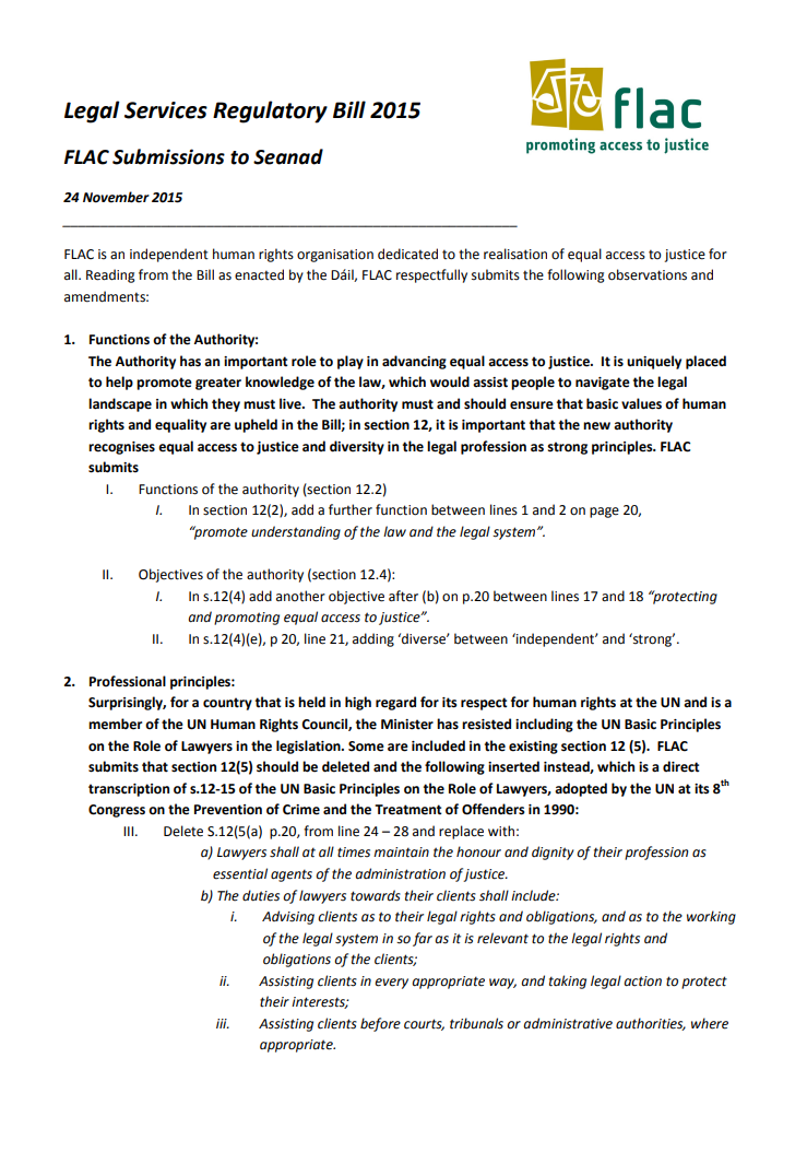 Legal Services Regulatory Bill 2015 FLAC Submissions to Seanad