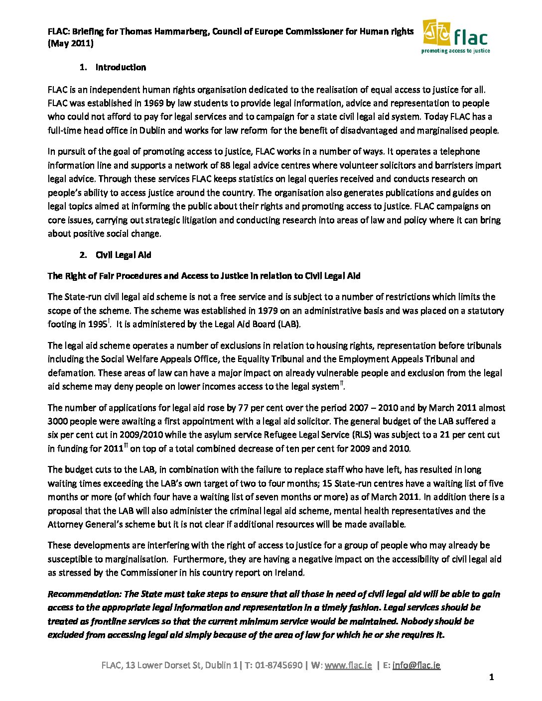 Submission for Thomas Hammarberg, Council of Europe Commissioner for Human Rights