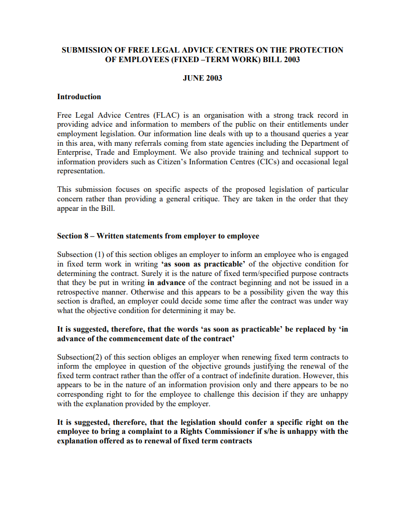 SUBMISSION OF FREE LEGAL ADVICE CENTRES ON THE PROTECTIONOF EMPLOYEES (FIXED –TERM WORK) BILL 2003