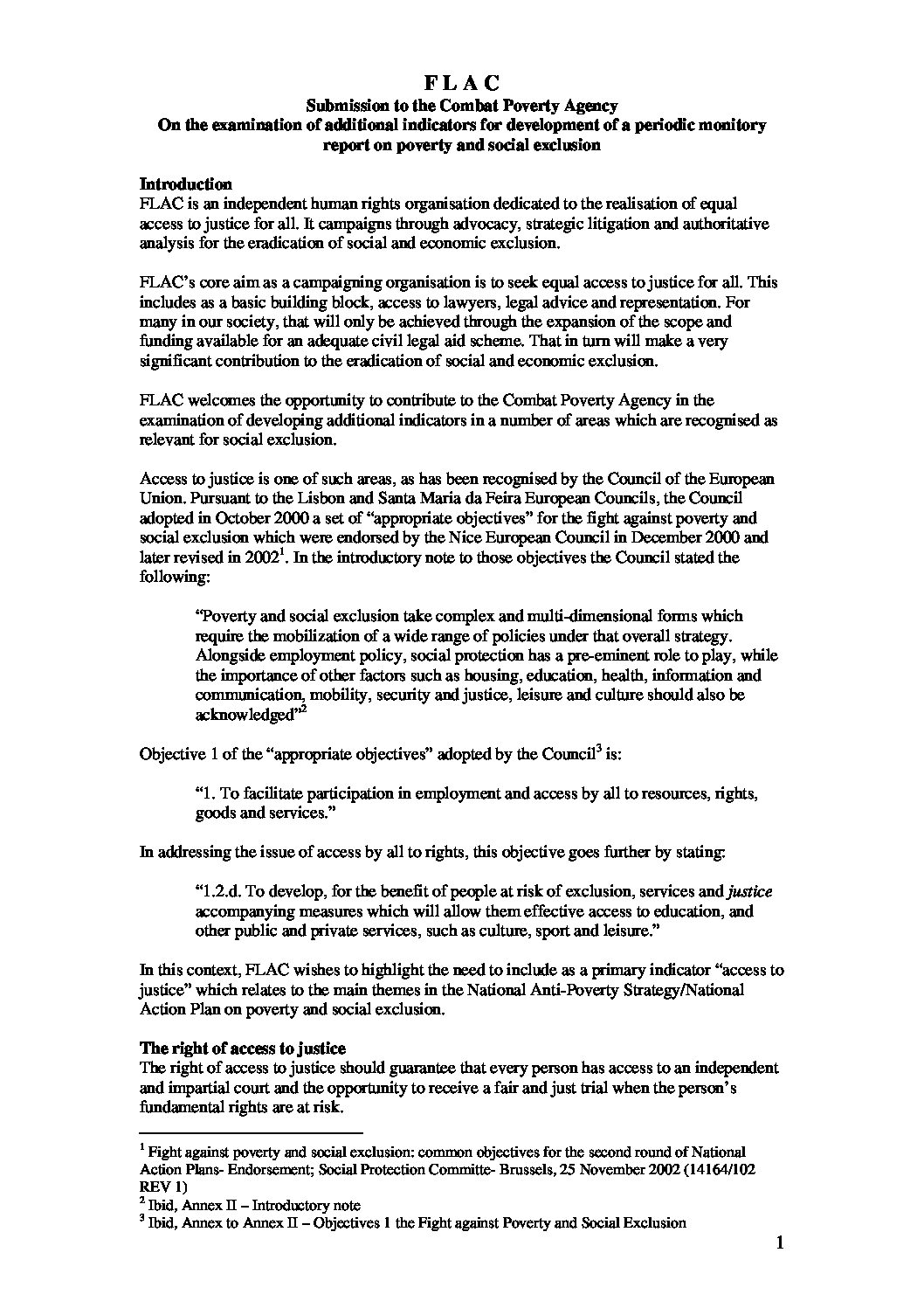 Submission to the Combat Poverty Agency on the examination of additional indicators for development of a periodic monitory report on poverty and social exclusion