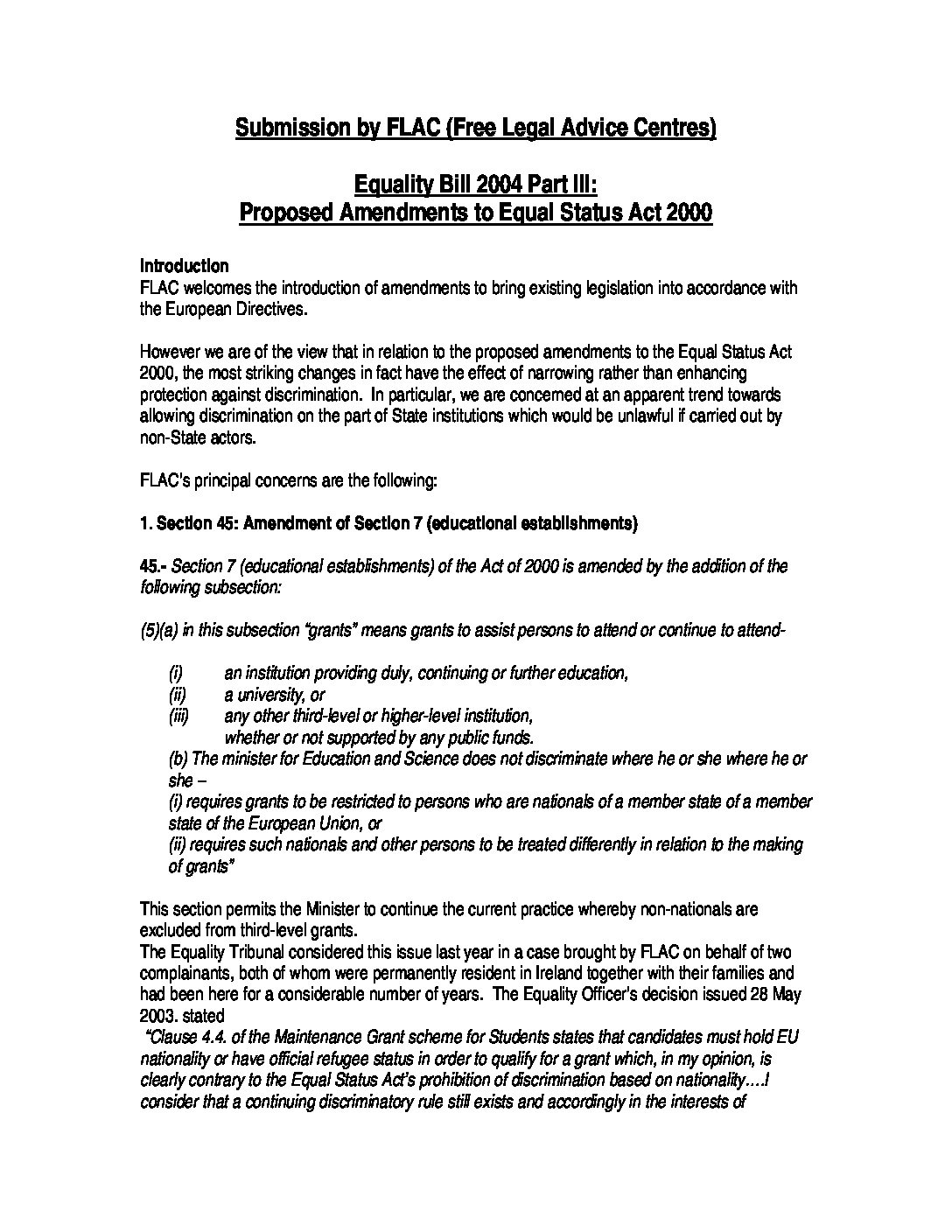 Submission to the Department of Justice, Equality and Law Reform on the Equality Bill 2004, Part III: Proposed Amendments to Equal Status Act 2000