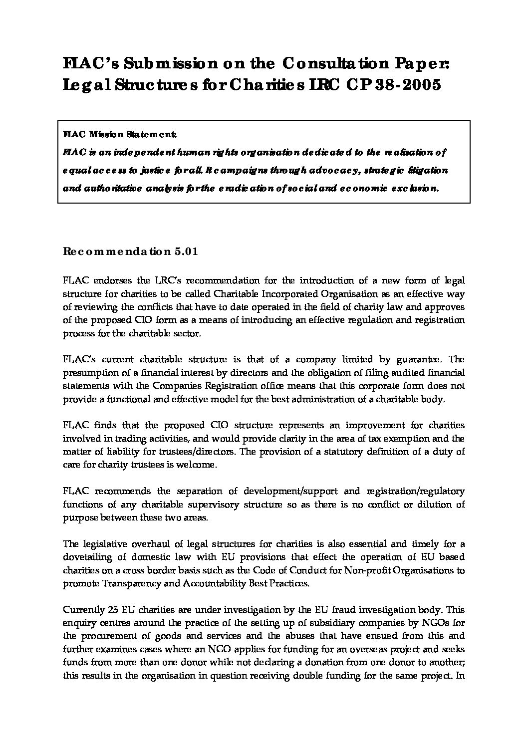 Submission to the Law Reform Commission on the Consultation Paper: Legal Structures for Charities LRC CP 38-2005